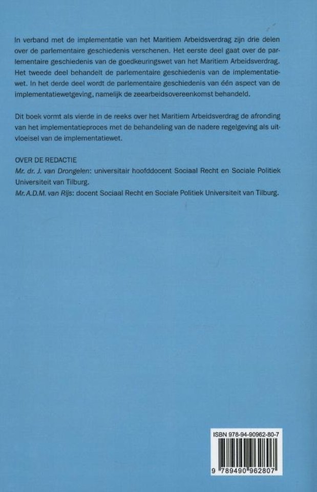 Dit boek vormt als vierde in de reeks over het Maritiem Arbeidsverdrag de afronding van het implementatieproces met de behandeling van de nadere regelgeving als uitvloeisel van de implementatiewet.