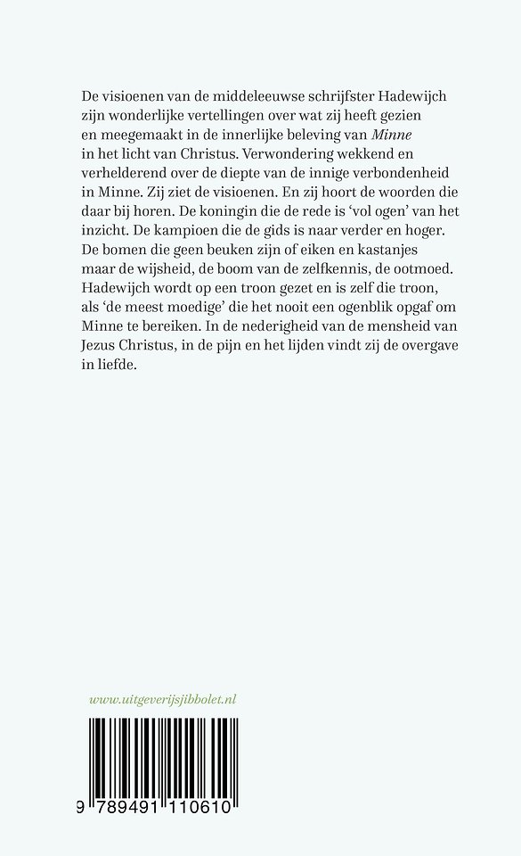 De visioenen van de middeleeuwse schrijfster Hadewijch zijn wonderlijke vertellingen over wat zij heeft gezien en meegemaakt in de innerlijke beleving van Minne in het licht van Christus. Verwondering wekkend en verhelderend over de diepte van de innige verbondenheid in Minne. Zij ziet de visioenen. En zij hoort de woorden die daar bij horen. De koningin die de rede is ‘vol ogen’ van het inzicht. De kampioen die de gids is naar verder en hoger. De bomen die geen beuken zijn of eiken en kastanjes maar de wijsheid, de boom van de zelfkennis, de ootmoed. Hadewijch wordt op een troon gezet en is zelf die troon, als ‘de meest moedige’ die het nooit een ogenblik opgaf om Minne te bereiken. In de nederigheid van de mensheid van Jezus Christus, in de pijn en het lijden vindt zij de overgave in liefde.