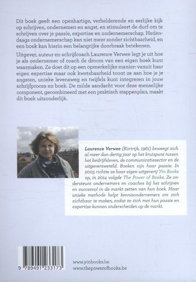 Na meer dan dertig jaar in zowel de uitgevers-, media- als communicatiesector te hebben gewerkt, en vaak tegelijkertijd, zette auteur Laurence Verwee de stap om een eigen boek te schrijven. De stap van uitgever en schrijfcoach naar auteur lijkt evident maar is het absoluut niet. Dat heeft ze bij het schrijven van dit boek maar al te goed ervaren. Niet alleen haar jarenlange ervaring kwam naar boven, maar ook haar vele struggles en angsten. Dit boek schrijven bood haar de kans om haar vele excuses onder de loep te leggen en haar angsten onder ogen te zien. Ook leerde ze alles op een rij te zetten, zodat ze jou en haar klanten nog beter kan begrijpen en ondersteunen.