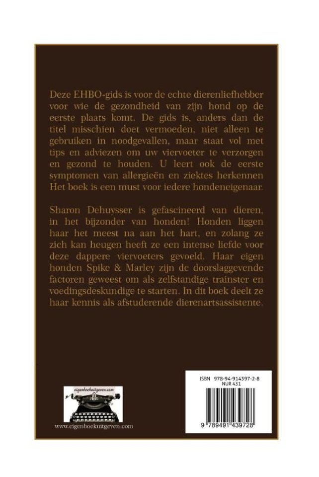 Deze EHBO-gids is voor de echte dierenliefhebber voor wie de gezondheid van zijn hond op de eerste plaats komt. De gids is, anders dan de titel misschien doet vermoeden, niet alleen te gebruiken in noodgevallen, maar staat vol met tips en adviezen om uw viervoeter te verzorgen en gezond te houden. U leert ook de eerste symptomen van allergieën en ziektes herkennen. Het boek is een must voor iedere hondeneigenaar.