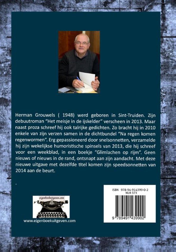 Herman Grouwels ( 1948) werd geboren in Sint-Truiden. Zijn debuutroman "Het meisje in de ijskelder" verscheen in 2013. Maar naast proza schreef hij ook talrijke gedichten. Zo bracht hij in 2010 enkele van zijn verzen samen in de dichtbundel "Na regen komen regenwormen". Erg gepassioneerd door snelsonnetten, verzamelde hij zijn wekelijkse humoristische spinsels van 2013, die hij schreef voor een weekblad, in een boekje "Glimlachen op rijm". Geen nieuws of nieuws in de rand, ontsnapt aan zijn aandacht. Met deze nieuwe uitgave met dezelfde titel komen zijn speedsonnetten van 2014 aan de beurt.