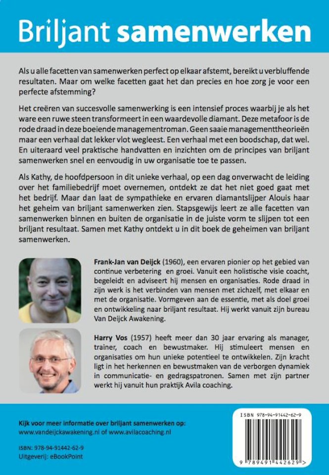 Geen saaie managementtheorieën maar een verhaal dat lekker vlot wegleest. Een verhaal met een boodschap, dat wel. En uiteraard veel praktische handvatten en inzichten om de principes van briljant samenwerken snel en eenvoudig in uw organisatie toe te passen. Als Kathy, de hoofdpersoon in dit unieke verhaal, op een dag onverwacht de leiding over het familiebedrijf moet overnemen, ontdekt ze dat het niet goed gaat met het bedrijf. Maar dan laat de sympathieke en ervaren diamantslijper Alouis haar het geheim van briljant samenwerken zien.
