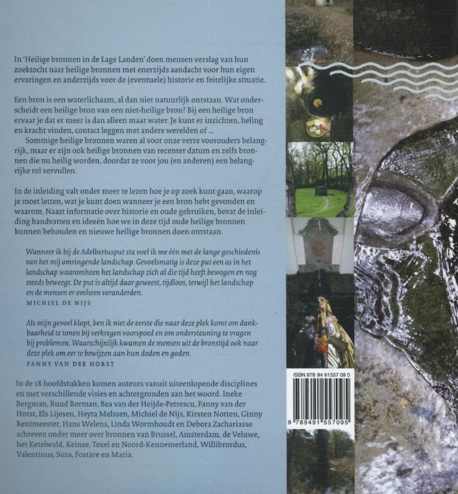 In 'Heilige bronnen in de Lage Landen' doen mensen verslag van hun zoektocht naar een of meer waterbronnen met enerzijds aandacht voor hun eigen ervaringen en anderzijds voor de (eventuele) historie en feitelijke situatie. In de algemene hoofdstukken valt onder meer te lezen hoe je op zoek kunt gaan, waarop je moet letten, wat je kunt doen wanneer je een bron hebt gevonden. En waarom je dat zou doen. De algemene hoofdstukken bevatten naast een handleiding voor het heden ook de nodige historische informatie.