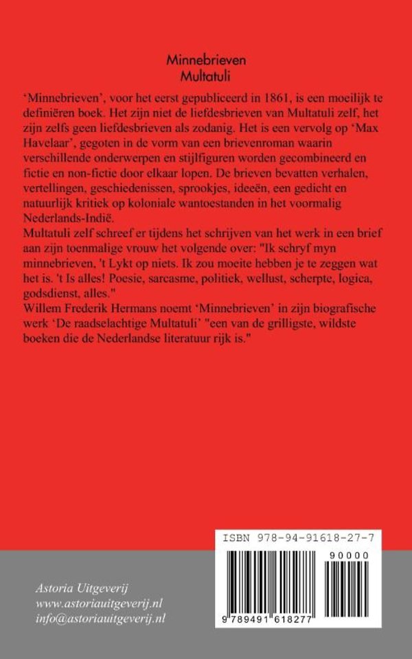 'Minnebrieven', voor het eerst gepubliceerd in 1861, is een moeilijk te definiëren boek. Het zijn niet de liefdesbrieven van Multatuli zelf, het zijn zelfs geen liefdesbrieven als zodanig. Het is een vervolg op 'Max Havelaar', gegoten in de vorm van een brievenroman waarin verschillende onderwerpen en stijlfiguren worden gecombineerd en fictie en non-fictie door elkaar lopen. De brieven bevatten verhalen, vertellingen, geschiedenissen, sprookjes, ideeën, een gedicht en natuurlijk kritiek op koloniale wantoestanden in het voormalig Nederlands-Indië.