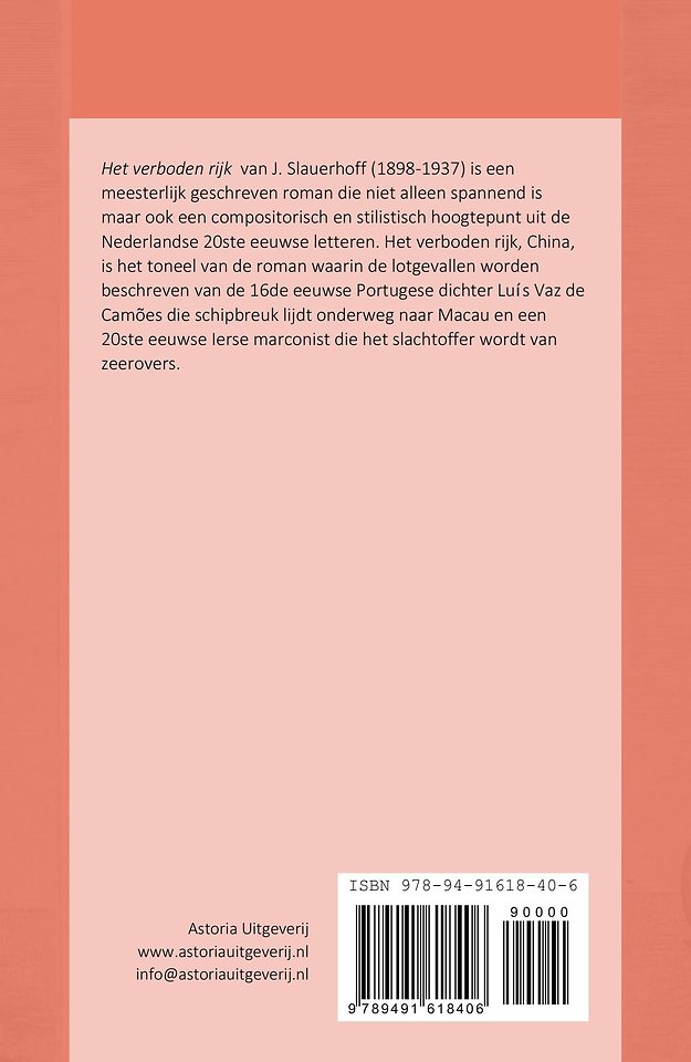'Het verboden rijk' van J. Slauerhoff (1898-1937) is een meesterlijk geschreven roman die niet alleen spannend is maar ook een compositorisch en stilistisch hoogtepunt uit de Nederlandse 20ste eeuwse letteren. Het verboden rijk, China, is het toneel van de roman waarin de lotgevallen worden beschreven van de 16de eeuwse Portugese dichter Luís Vaz de Camões die schipbreuk lijdt onderweg naar Macau en een 20ste eeuwse Ierse marconist die het slachtoffer wordt van zeerovers.