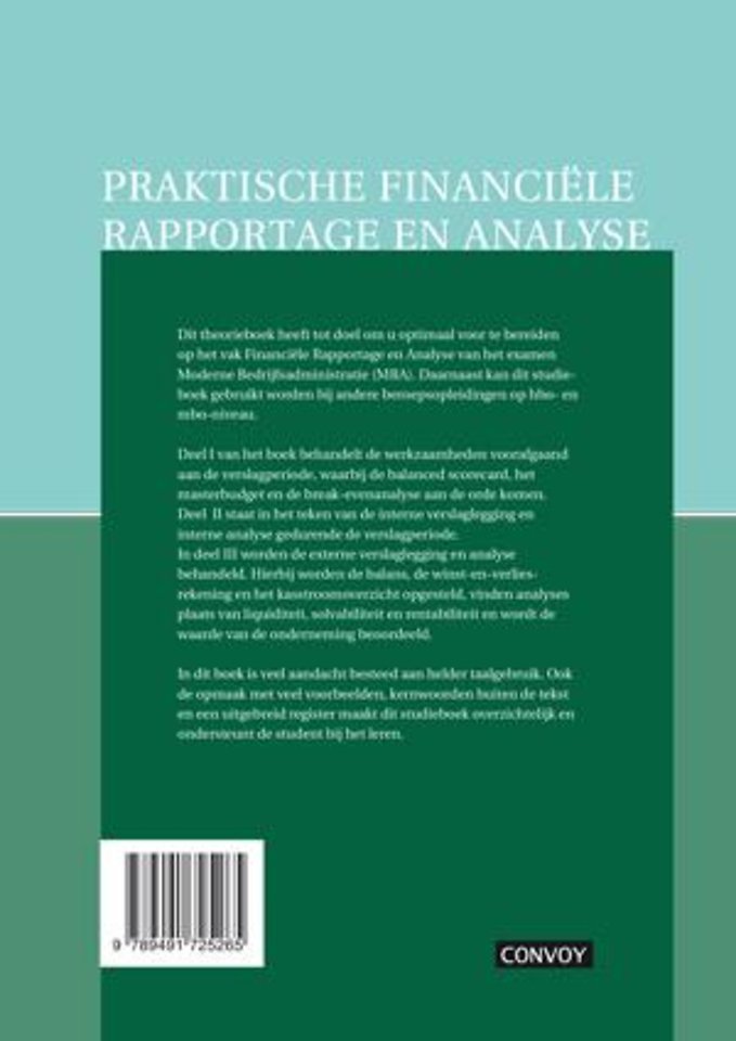 Dit theorieboek heeft tot doel om u optimaal voor te bereiden op het vak Financiële Rapportage en Analyse van het examen Moderne Bedrijfsadministratie (MBA). Daarnaast kan dit studieboek gebruikt worden bij andere beroepsopleidingen op hbo- en mbo-niveau.