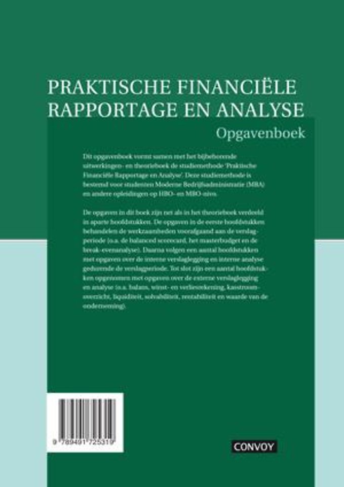 Dit opgavenboek vormt samen met het bijbehorende uitwerkingen- en theorieboek de studiemethode 'Praktische Financiële Rapportage en Analyse'. Deze studiemethode is bestemd voor studenten Moderne Bedrijfsadministratie (MBA) en andere opleidingen op HBO- en MBO-nivo.