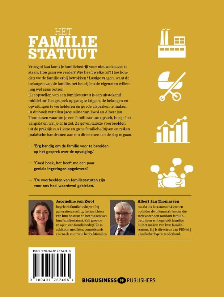 In dit boek vertellen Jacqueline van Zwol en Albert jan Thomassen waarom je een familiestatuut opstelt, wat je er in zet en hoe je het aanpakt. Ze geven talloze voorbeelden uit de praktijk van kleine en grote familiebedrijven en reiken praktische handvatten aan om direct mee aan de slag te gaan.
