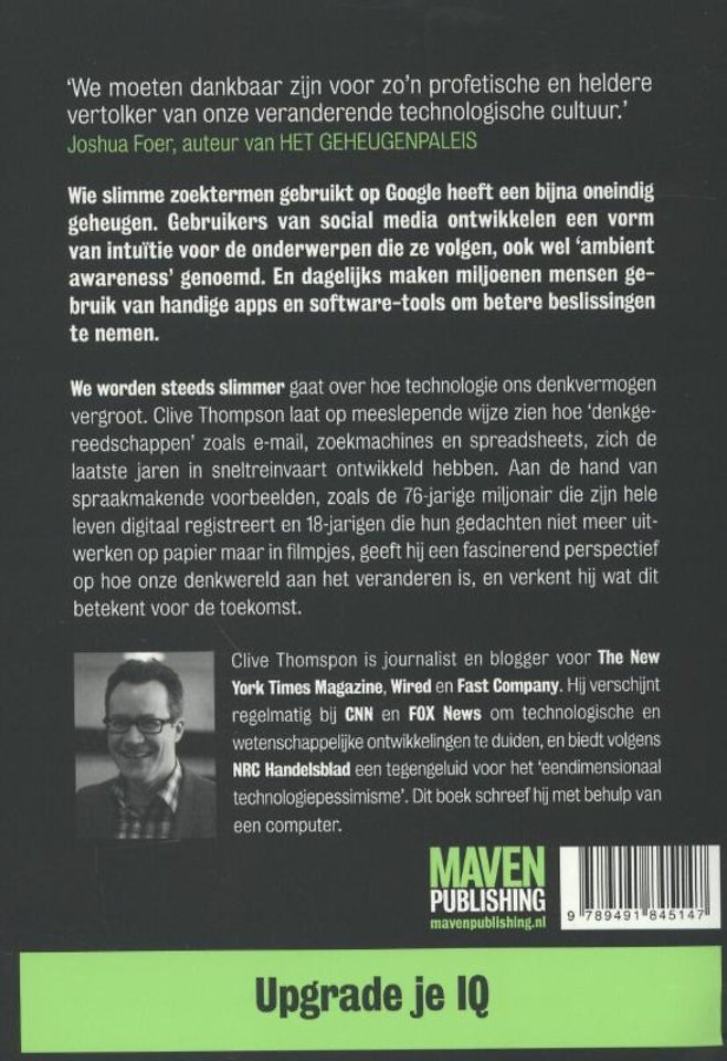 'We worden steeds slimmer' gaat over hoe technologie ons denkvermogen vergroot. Clive Thompson laat op meeslepende wijze zien hoe onze 'denkgereedschappen' zoals e-mail, zoekmachines en spreadsheets, zich de laatste jaren in sneltreinvaart ontwikkeld hebben. Aan de hand van spraakmakende voorbeelden, zoals de 76-jarige miljonair die zijn hele leven digitaal registreert en 18-jarigen die hun gedachten niet meer uitwerken op papier maar in filmpjes, geeft hij een fascinerend perspectief op hoe onze denkwereld aan het veranderen is, en verkent hij wat dit betekent voor de toekomst.