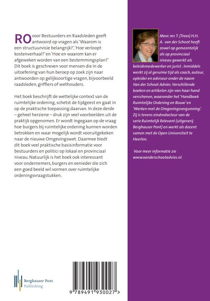 In deze nieuwe, derde druk van 'RO voor raadsleden en bestuurders' worden de verschillende instrumenten besproken en geplaatst in de huidige tijdgeest van crisis, krimp, leegstand, burgerparticipatie, organische ontwikkeling en uitnodigingsplanologie. Er zijn veel concrete voorbeelden opgenomen, die de tekst verduidelijken. Besproken wordt hoe burgers beter bij ruimtelijke ordening betrokken kunnen worden.