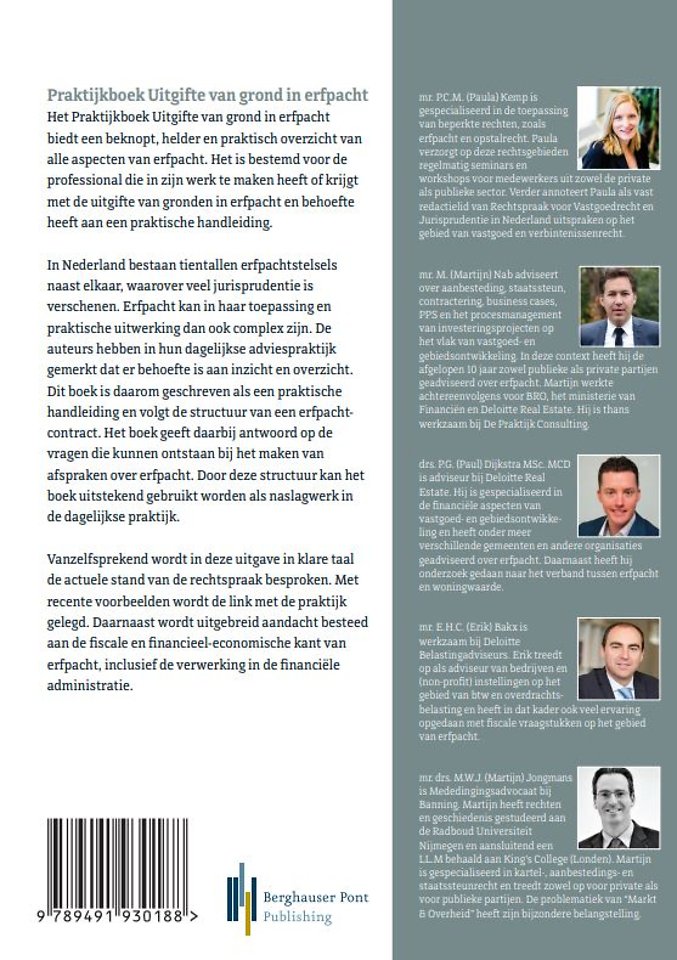 In Nederland bestaan tientallen erfpachtstelsels naast elkaar, waarover veel jurisprudentie is verschenen. Erfpacht kan in haar toepassing en praktische uitwerking dan ook complex zijn. De auteurs hebben in hun dagelijkse adviespraktijk gemerkt dat er behoefte is aan inzicht en overzicht. Dit boek is daarom geschreven als een praktische handleiding en volgt de structuur van een erfpachtcontract. Het geeft daarbij antwoord op de vragen die kunnen ontstaan bij het maken van afspraken over erfpacht. Door deze structuur kan het uitstekend gebruikt worden als naslagwerk in de dagelijkse praktijk.