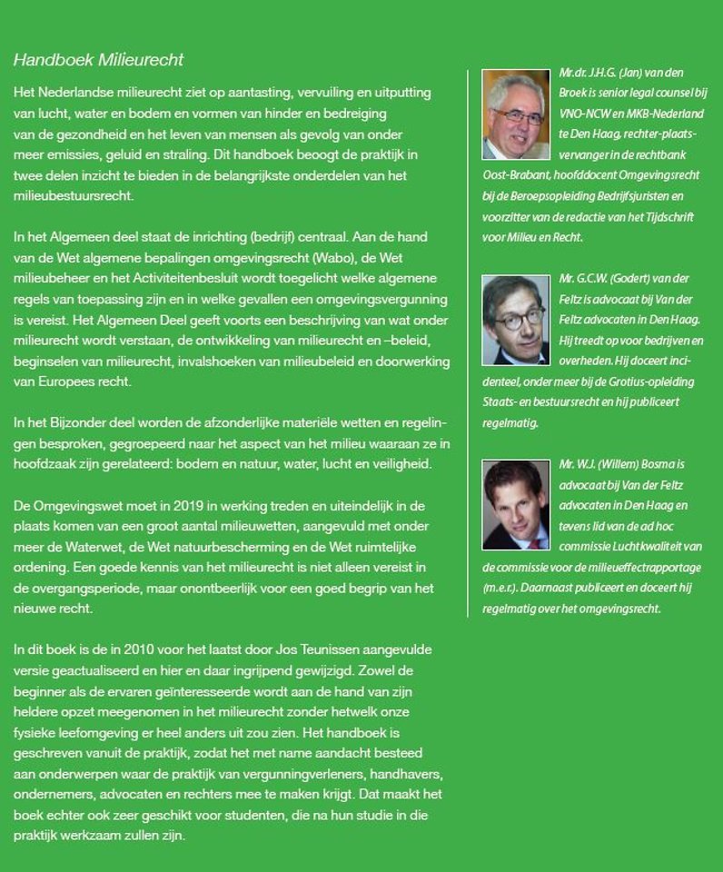 In dit boek is de in 2010 voor het laatst door Jos Teunissen aangevulde versie geactualiseerd en hier en daar ingrijpend gewijzigd. Het handboek is geschreven vanuit de praktijk, zodat het met name aandacht besteed aan onderwerpen waar de praktijk van vergunningverleners, handhavers, ondernemers, advocaten en rechters mee te maken krijgt. Dat maakt het boek echter ook zeer geschikt voor studenten, die na hun studie in die praktijk werkzaam zullen zijn.