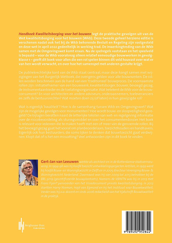 Handboek Kwaliteitsborging voor het bouwen legt de praktische gevolgen uit van de Wet kwaliteitsborging voor het bouwen (Wkb). Deze tweede geheel herziene editie is verschenen nadat ook het bij de Wkb behorende Besluit en Regeling zijn vastgesteld en deze wet in april 2022 gedeeltelijk in werking trad. De inwerkingtreding van de Wkb samen met de Omgevingswet komt eraan. Nu de spelregels vaststaan en het speelveld is bepaald – voor de Wkb vooralsnog alleen relatief eenvoudige bouwwerken in gevolgklasse 1 – geeft dit boek voor alle die een rol spelen binnen dit veld houvast over wat er van hen wordt verwacht, en over hoe het samenspel met anderen gestalte krijgt.