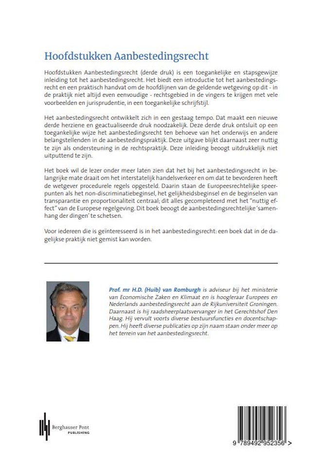Het aanbestedingsrecht ontwikkelt zich in een gestaag tempo. Dat maakt een nieuwe derde herziene en geactualiseerde druk noodzakelijk. Hoofdstukken Aanbestedingsrecht ontsluit op een toegankelijke en vlot geschreven wijze het aanbestedingsrecht ten behoeve van het onderwijs en andere belangstellenden in het aanbestedingsrecht. Deze uitgave blijkt tevens zeer nuttig te zijn als ondersteuning in de rechtspraktijk. Hoofdstukken Aanbestedingsrecht beoogt uitdrukkelijk niet uitputtend te zijn.