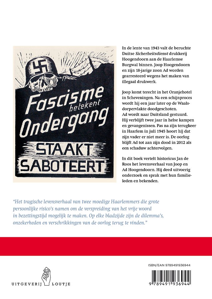 “Het tragische levensverhaal van twee moedige Haarlemmers die grote persoonlijke risico’s namen om de verspreiding van het vrije woord in bezettingstijd mogelijk te maken. Op elke bladzijde zijn de dilemma’s, onzekerheden en verschrikkingen van de oorlog terug te vinden.”