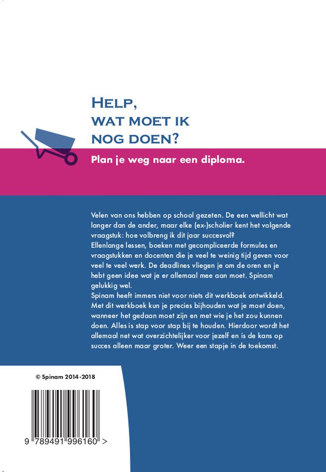 Velen van ons hebben op school gezeten. De een wellicht wat langer dan de ander, maar elke (ex-)scholier kent het volgende vraagstuk: hoe volbreng ik dit jaar succesvol? Ellenlange lessen, boeken met gecompliceerde formules en vraagstukken en docenten die je veel te weinig tijd geven voor veel te veel werk. De deadlines vliegen je om de oren en je hebt geen idee wat je er allemaal mee aan moet. Spinam gelukkig wel. Spinam heeft immers niet voor niets dit werkboek ontwikkeld. Met dit werkboek kun je precies bijhouden wat je moet doen, wanneer het gedaan moet zijn en met wie je het zou kunnen doen. Alles is stap voor stap bij te houden. Hierdoor wordt het allemaal net wat overzichtelijker voor jezelf en is de kans op succes alleen maar groter. Weer een stapje in de toekomst.