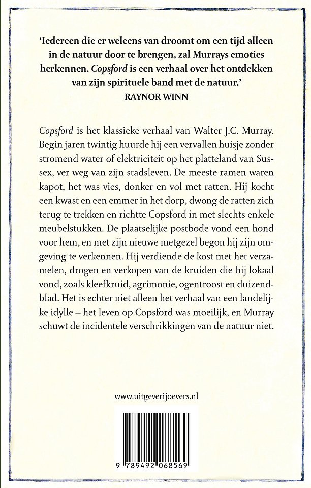 Copsford, veelvuldig aanwezig en een inspiratiebron in De wilde stilte van Raynor Winn, is een buitengewoon boek. Copsford is het klassieke verhaal van Walter J.C. Murray. Begin jaren twintig huurde hij een vervallen huisje zonder stromend water of elektriciteit op het platteland van Sussex, ver weg van zijn stadsleven. De meeste ramen waren kapot, het was vies, donker en vol met ratten. Hij kocht een kwast en een emmer in het dorp, dwong de ratten zich terug te trekken en richtte Copsford in met slechts enkele meubelstukken. De plaatselijke postbode vond een hond voor hem, en met zijn nieuwe metgezel begon hij zijn omgeving te verkennen. Hij verdiende de kost met het verzamelen, drogen en verkopen van de kruiden die hij lokaal vond, zoals kleefkruid, agrimonie, ogentroost en duizendblad. Het is echter niet alleen het verhaal van een landelijke idylle – het leven op Copsford was moeilijk, en Murray schuwt de incidentele verschrikkingen van de natuur niet.