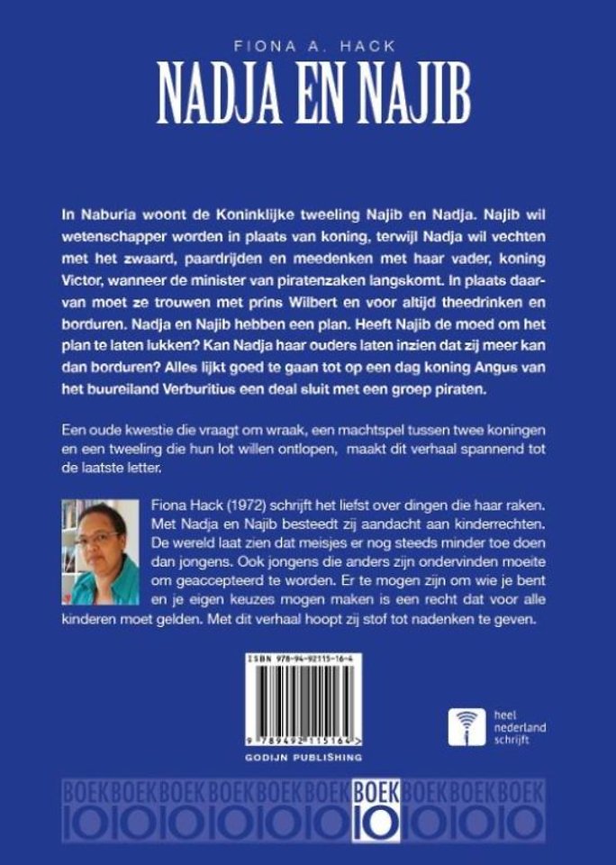 Fiona Hack (1972) schrijft het liefst over dingen die haar raken. Met Nadja en Najib besteedt zij aandacht aan kinderrechten. De wereld laat zien dat meisjes er nog steeds minder toe doen dan jongens. Ook jongens die anders zijn ondervinden moeite om geaccepteerd te worden. Er te mogen zijn om wie je bent en je eigen keuzes mogen maken is een recht dat voor alle kinderen moet gelden. Met dit verhaal hoopt zij stof tot nadenken te geven.