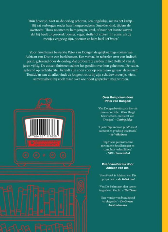 Voor Familieziek bewerkte Peter van Dongen de gelijknamige roman van Adriaan van Dis tot een beeldroman. Een verhaal in taferelen over een Indisch gezin, getekend door de oorlog, dat probeert te aarden in het Holland van de jaren vijftig. De zussen fluisteren achter het gordijn over hun geheimen. De vader, gebrand op rechtsherstel, bereidt zijn zoon voor op een nieuw gevaar: de Russen! Temidden van dit alles vindt de jongen troost bij zijn schaduwbroertje, wiens aanwezigheid hij voelt maar over wie nooit gesproken mag worden.