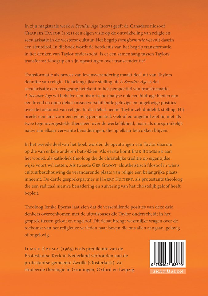In zijn magistrale werk A Secular Age geeft de Canadese filosoof CHARLES TAYLOR (1931) een eigen visie op de ontwikkeling van religie en secularisatie in onze westerse cultuur. Het begrip transformatie vervult daarin een sleutelrol. Transformatie maakt deel uit van zijn sterk op de geloofspraktijk gerichte definitie van religie. De levensverandering waartoe de religie oproept is voor Taylor minstens zo belangrijk als het geloof in een hogere werkelijkheid. Transcendentie en transformatie zijn niet los van elkaar te zien.