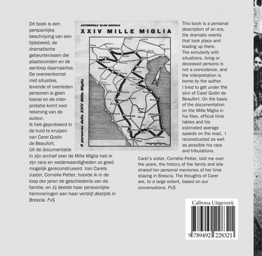 Uit de documentatie in zijn archief over de Mille Miglia heb ik zijn race en wederwaardigheden zo goed mogelijk gereconstrueerd. Van Carels zuster, Cornelie Petter, hoorde ik in de loop der jaren de geschiedenis van de familie en zij deelde haar persoonlijke herinneringen aan haar verblijf destijds in Brescia. FvS