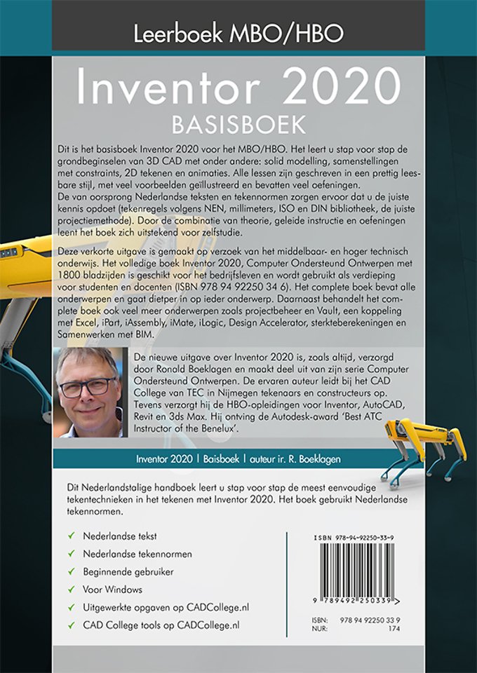 Deze nieuwe uitgave over Inventor 2020 is, zoals altijd, verzorgt door Ronald Boeklagen en maakt deel uit van zijn serie Computer Ondersteund Ontwerpen. De ervaren auteur leidt bij het CAD College van TEC in Nijmegen tekenaars en constructeurs op. Tevens verzorgt hij de HBO-opleidingen voor Inventor, AutoCAD, 3ds Max en Revit. Hij ontving de Autodesk award ‘Best ATC Instructor of the Benelux’.