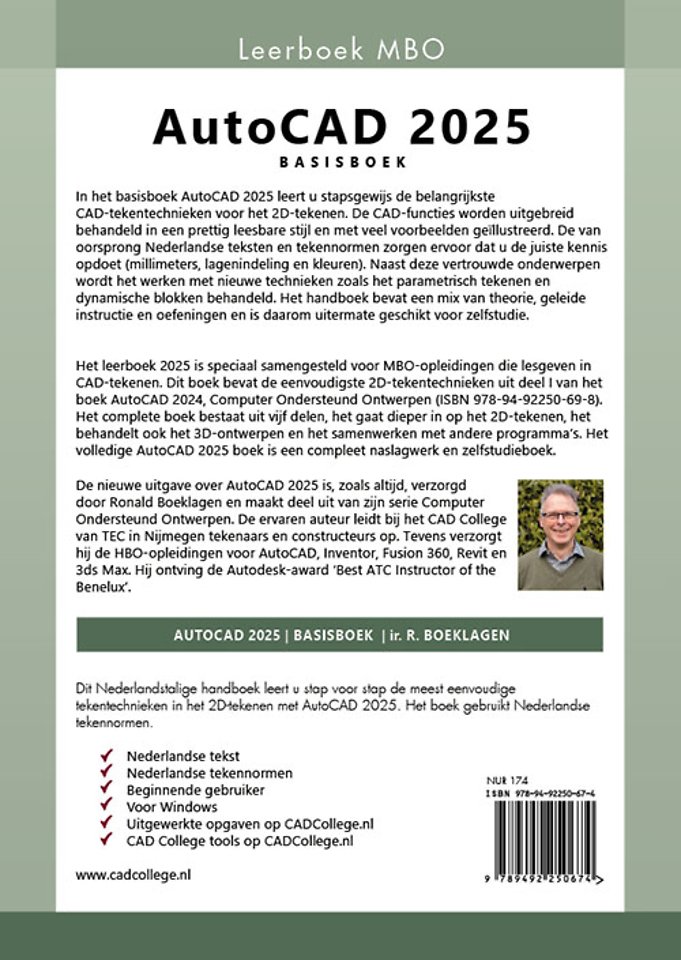 De nieuwe uitgave over AutoCAD 2025 is, zoals altijd, verzorgd door Ronald Boeklagen en maakt deel uit van zijn serie Computer Ondersteund Ontwerpen. De ervaren auteur leidt bij het CAD College van TEC in Nijmegen tekenaars en constructeurs op. Tevens verzorgt hij de HBO-opleidingen voor AutoCAD, Inventor, Revit en 3ds Max. Hij ontving de Autodesk-award ‘Best ATC Instructor of the Benelux’.