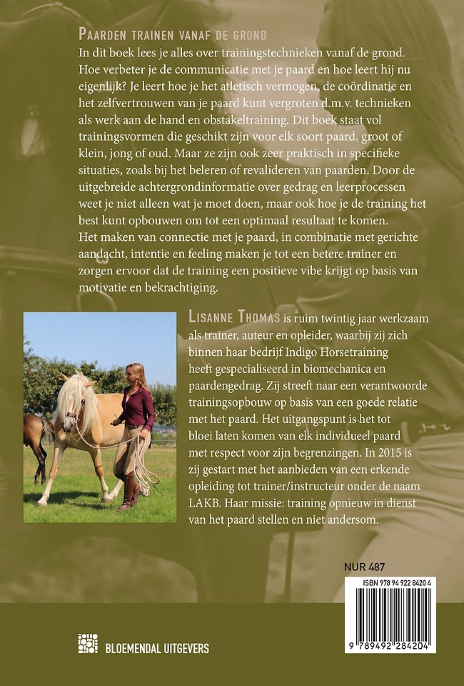 LISANNE THOMAS is ruim twintig jaar werkzaam als trainer, auteur en opleider, waarbij zij zich binnen haar bedrijf Indigo Horsetraining heeft gespecialiseerd in biomechanica en paardengedrag. Zij streeft naar een verantwoorde trainingsopbouw op basis van een goede relatie met het paard. Het uitgangspunt is het tot bloei laten komen van elk individueel paard met respect voor zijn begrenzingen. In 2015 is zij gestart met het aanbieden van een erkende opleiding tot trainer/instructeur onder de naam LAKB. Haar missie: training opnieuw in dienst van het paard stellen en niet andersom.