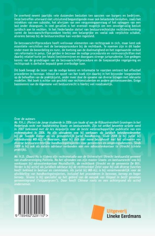 Dit boek beoogt de lezer van de nodige kennis en informatie te voorzien omtrent het effectief pro-cederen in bezwaar. Inhoud en opzet van het boek zijn daarbij in het bijzonder toegesneden op de behoeften van de praktijkjurist, onder meer door de opname van diverse bijlagen met relevante modellen. Het boek is echter ook geschikt voor rechtenstudenten en andere geïnteresseerden. Enige basiskennis van de Algemene wet bestuursrecht is hierbij wel noodzakelijk.