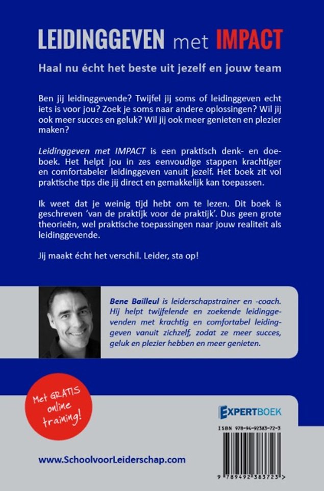 Leidinggeven met IMPACT is een praktisch denk- en doe-boek. Het helpt jou in zes eenvoudige stappen krachtiger en comfortabeler leidinggeven vanuit jezelf. Het boek zit vol praktische tips die jij direct en gemakkelijk kan toepassen.