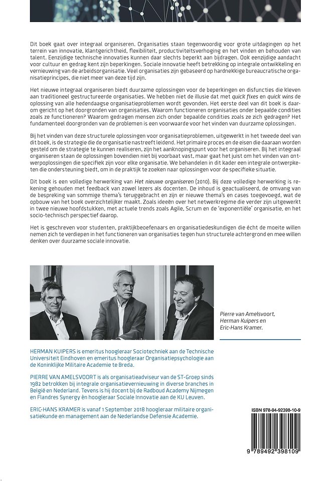 Dit boek gaat over integraal organiseren. Organisaties staan tegenwoordig voor grote uitdagingen op het terrein van innovatie, klantgerichtheid, flexibiliteit, productiviteitsverhoging en het vinden en behouden van talent. Eenzijdige technische innovaties kunnen daar slechts beperkt aan bijdragen.