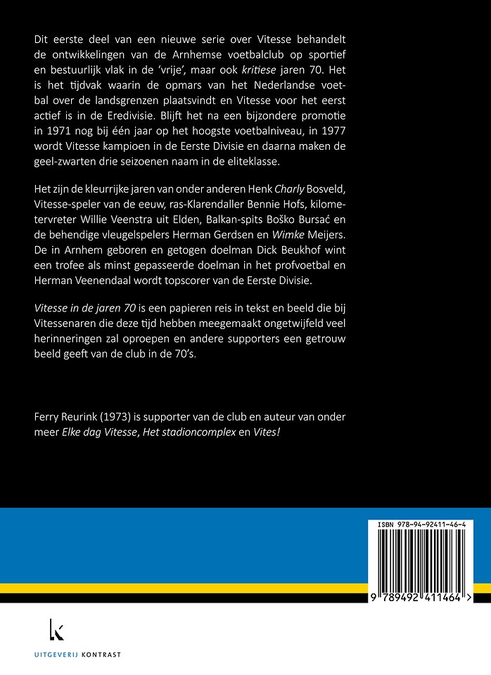 Vitesse in de jaren 70 is een papieren reis in tekst en beeld die bij Vitessenaren die deze tijd hebben meegemaakt ongetwijfeld veel herinneringen zal oproepen en andere supporters een getrouw beeld geeft van de club in de 70’s.