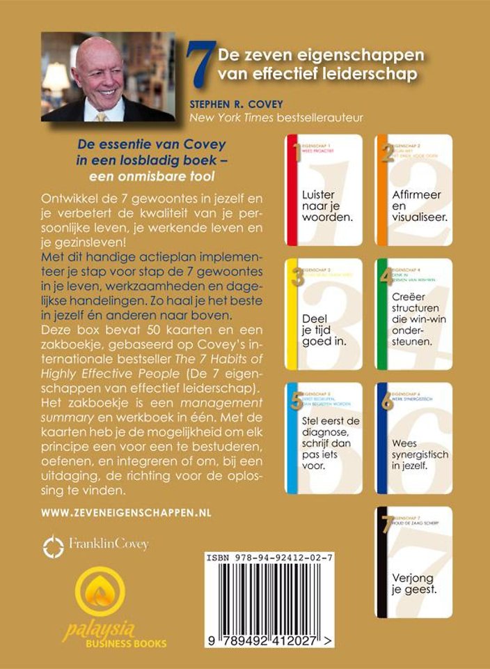 Deze box bevat 50 kaarten en een zakboekje, gebaseerd op Covey's internationale bestseller The 7 Habits of Highly Effective People (De 7 eigenschappen van effectief leiderschap). Het zakboekje bevat de essentie van Covey's werk, en is een management summary en direct toepasbaar werkboek in één.