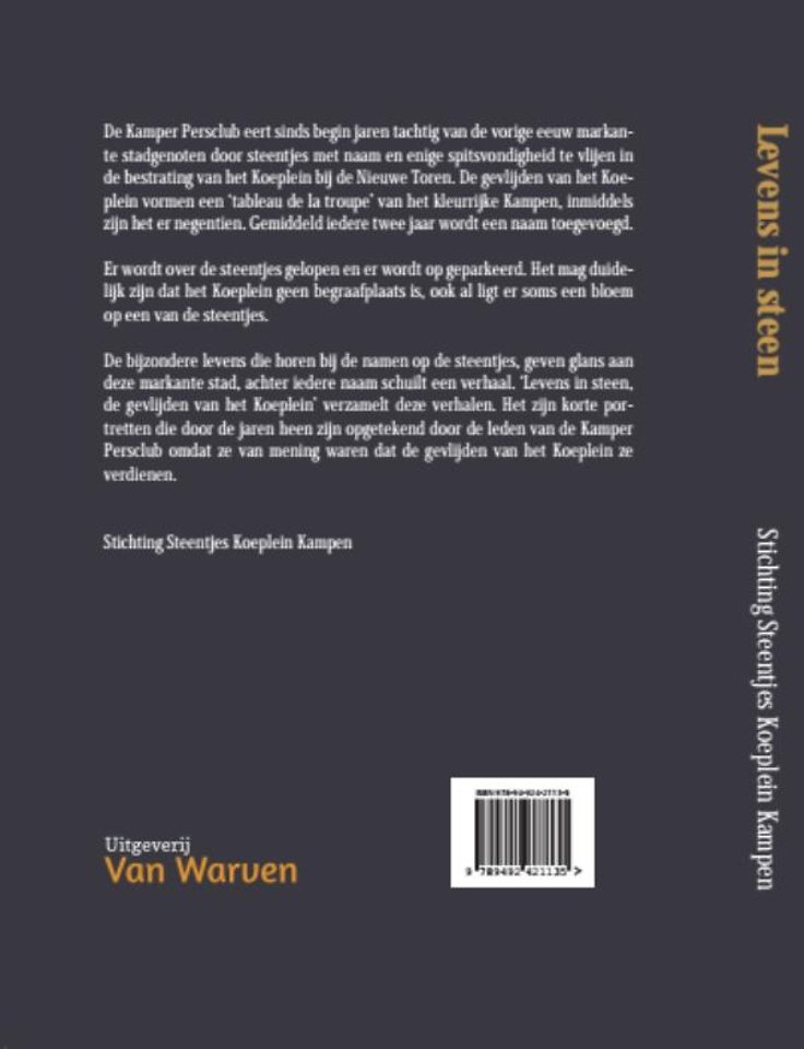 De bijzondere levens die horen bij de namen op de steentjes, geven glans aan deze markante stad, achter iedere naam schuilt een verhaal. Levens in steen, de gevlijden van het Koeplein verzamelt deze verhalen. Het zijn korte portretten die door de jaren heen zijn opgetekend door de leden van de Kamper Persclub omdat ze van mening waren dat de gevlijden van het Koeplein ze verdienen.