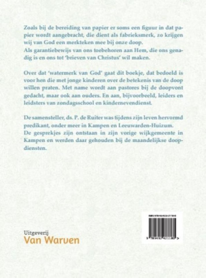 Over dat 'watermerk van God' gaat dit boekje, dat bedoeld is voor hen die met jonge kinderen over de betekenis van de doop willen praten. Met name wordt aan pastores bij de doopvont gedacht, maar ook aan ouders. En aan, bijvoorbeeld, leiders en leidsters van zondagsschool en kindernevendienst.