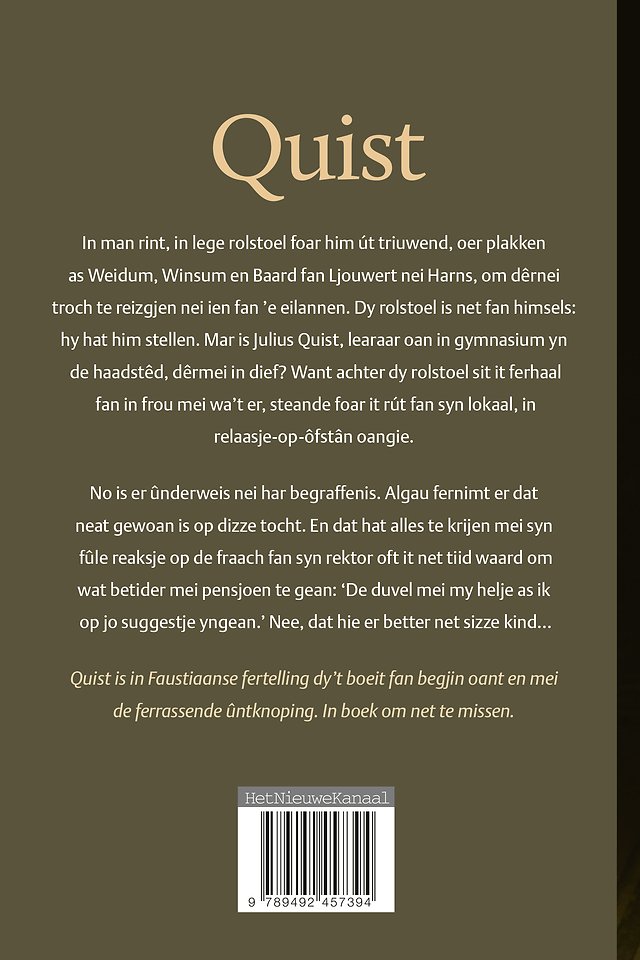 Quist is in Faustiaanse fertelling dy’t boeit fan begjin oant en mei de ferrassende ûntknoping. In boek om net te missen.