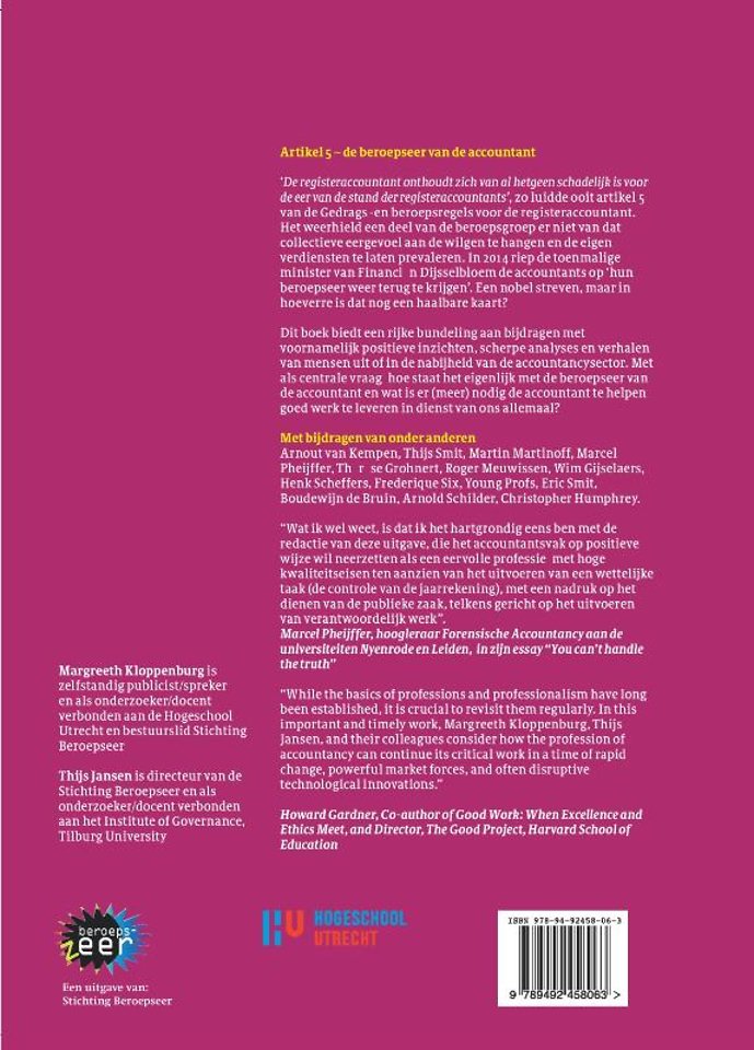 Dit boek biedt een rijke bundeling aan bijdragen met voornamelijk positieve inzichten, scherpe analyses en verhalen van mensen uit of in de nabijheid van de accountancysector. Met als centrale vraag hoe staat het eigenlijk met de beroepseer van de accountant en wat is er (meer) nodig de accountant te helpen goed werk te leveren in dienst van ons allemaal?