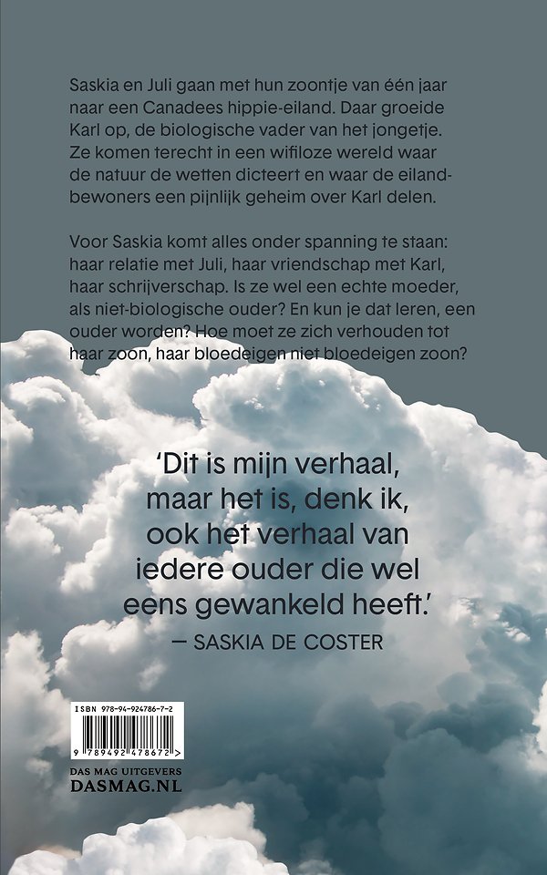 Voor Saskia komt alles onder spanning te staan: haar relatie met Juli, haar vriendschap met Karl, haar schrijverschap. Is ze wel een echte moeder, als niet-biologische ouder? En kun je dat leren, een ouder worden? Hoe moet ze zich verhouden tot haar zoon, haar bloedeigen niet bloedeigen zoon?
