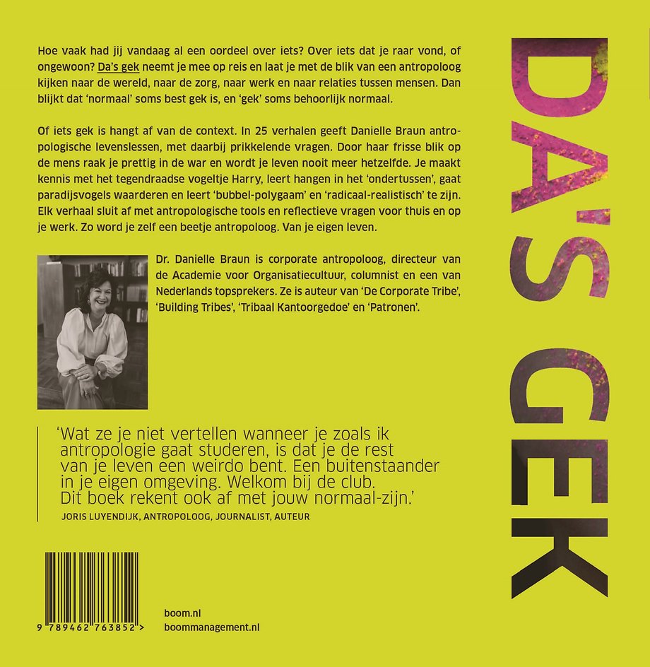 Of iets gek is hangt af van de context. In 25 verhalen geeft Danielle Braun antropologische levenslessen, met daarbij prikkelende vragen. Door haar frisse blik op de mens raak je prettig in de war en wordt je leven nooit meer hetzelfde. Je maakt kennis met het tegendraadse vogeltje Harry, leert hangen in het ‘ondertussen’, gaat paradijsvogels waarderen en leert ‘bubbel-polygaam’ en ‘radicaal-realistisch’ te zijn. Elk verhaal sluit af met antropologische tools en reflectieve vragen voor thuis en op je werk. Zo word je zelf een beetje antropoloog. Van je eigen leven.