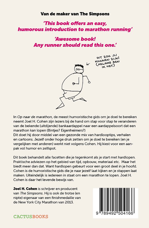 Dit doet hij door middel van een gezonde mix van hardlooptips, verhalen en cartoons. Jezelf onder hoge druk zetten om je doel te bereiken werkt niet volgens Cohen. Hij kiest voor een aanpak vol humor en zelfspot.