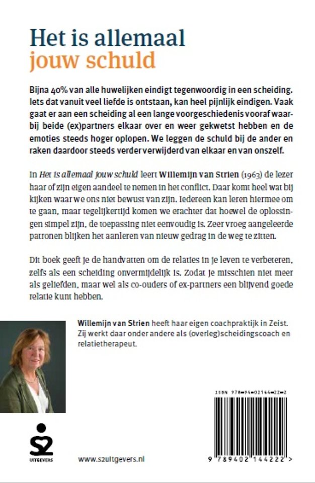 In Het is allemaal jouw schuld leert Willemijn van Strien de lezer haar of zijn eigen aandeel te nemen in het conflict. Daar komt heel wat bij kijken waar we ons niet bewust van zijn. Iedereen kan leren hiermee om te gaan, maar tegelijkertijd komen we erachter dat hoewel de oplossingen simpel zijn, de toepassing niet eenvoudig is. Zeer vroeg aangeleerde patronen blijken het aanleren van nieuw gedrag in de weg te zitten.