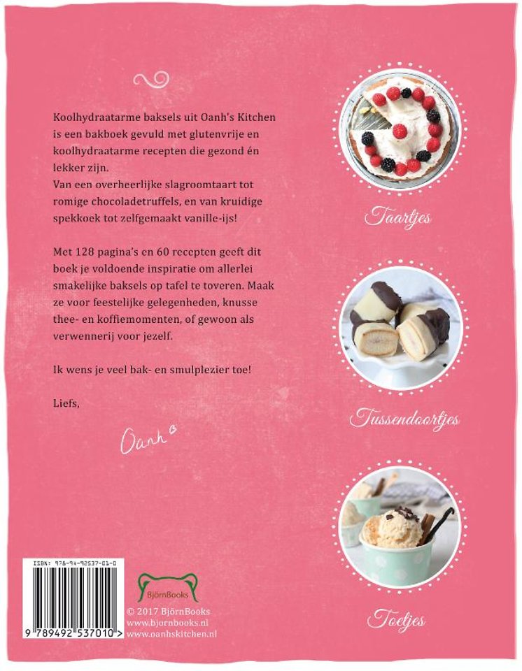 Koolhydraatarme Baksels uit Oanh's Kitchen. Koolhydraatarm! Een boek boordevol taartjes, cakejes, ijsjes, bonbons en desserts. Koolhydraatarme Baksels is reeds het 3e boek welke verschijnt van de hand van foodblogger Oanh (Oanh's Kitchen). Uiteraard wordt ook in dit boek geen gebruik gemaakt van geraffineerde suikers en alle recepten zijn glutenvrij. Dit boek is deel 3 uit de 5-delige serie koolhydraatarme kookboeken van Oanh's Kitchen