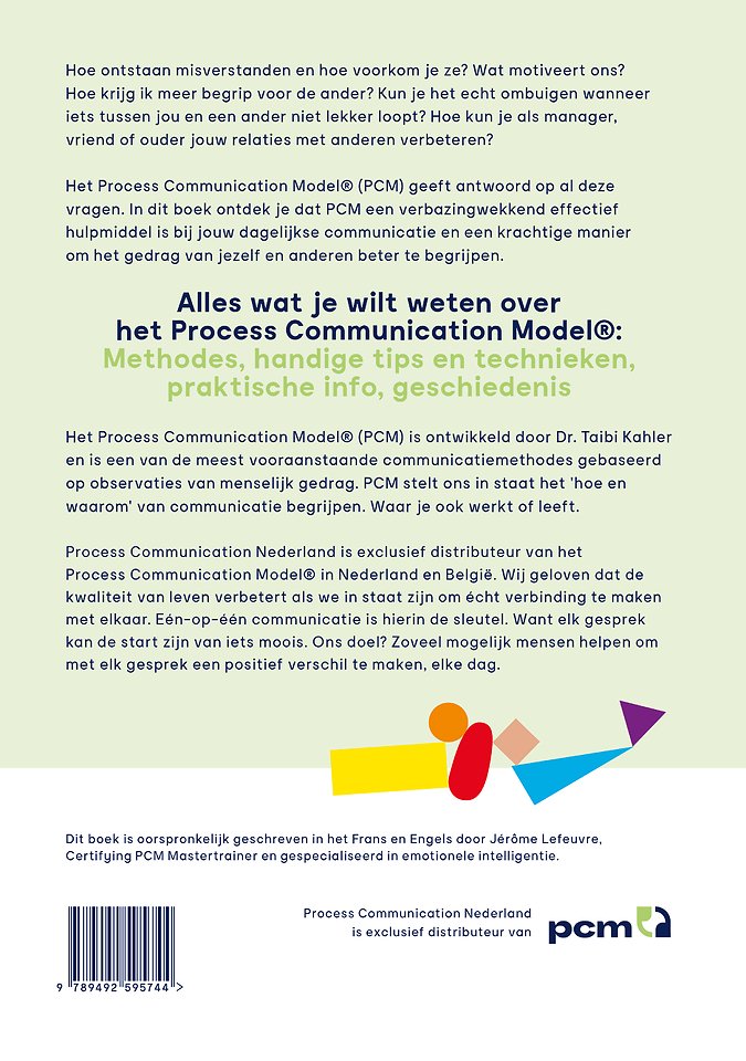 Het Process Communication Model® (PCM) geeft antwoord op al deze vragen. In dit boek ontdek je dat PCM een verbazingwekkend effectief hulpmiddel is bij jouw dagelijkse communicatie en een krachtige manier om het gedrag van jezelf en anderen beter te begrijpen.