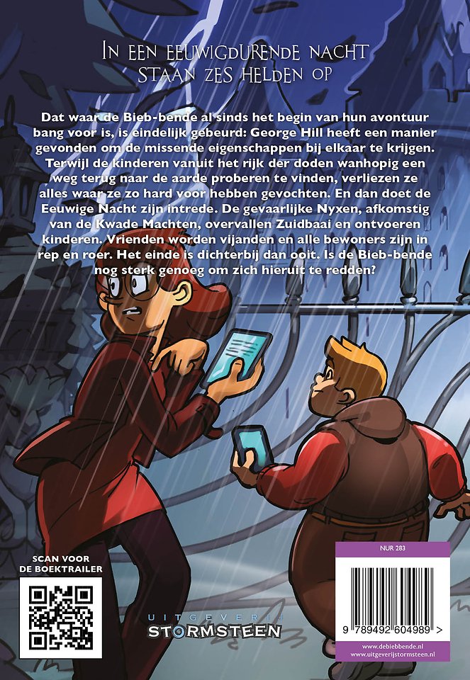 Dat waar de Bieb-bende al sinds het begin van hun avontuur bang voor is, is eindelijk gebeurd: George Hill heeft een manier gevonden om de missende eigenschappen bij elkaar te krijgen. Terwijl de kinderen vanuit het rijk der doden wanhopig een weg terug naar de aarde proberen te vinden, verliezen ze alles waar ze zo hard voor hebben gevochten. En dan doet de Eeuwige Nacht zijn intrede. De gevaarlijke Nyxen, afkomstig van de Kwade Machten, overvallen Zuidbaai en ontvoeren kinderen. Vrienden worden vijanden en alle bewoners zijn in rep en roer. Het einde is dichterbij dan ooit. Is de Bieb-bende nog sterk genoeg om zich hieruit te redden?
