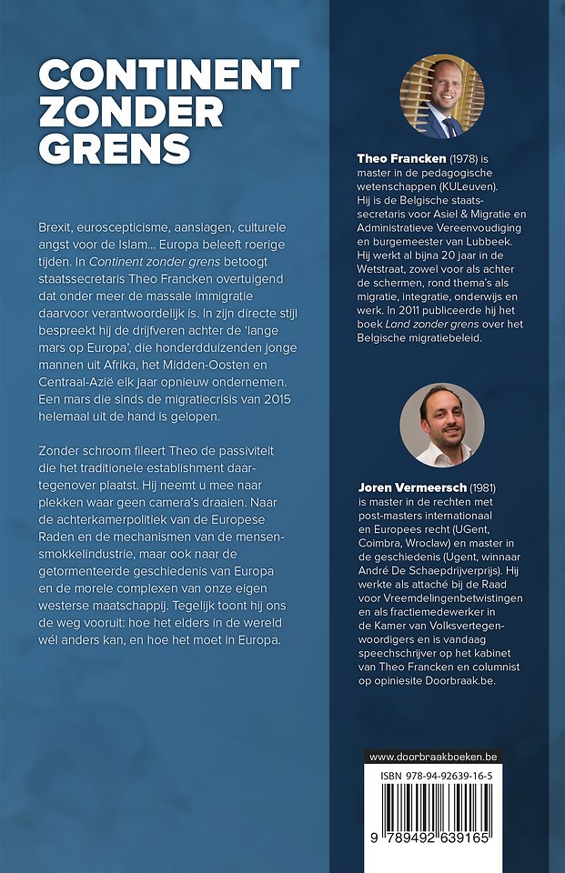 Brexit, euroscepticisme, aanslagen, culturele angst voor de islam... Europa beleeft roerige tijden. In Continent zonder grens betoogt staatssecretaris Theo Francken overtuigend dat onder meer de massale immigratie daarvoor verantwoordelijk is. In zijn directe stijl bespreekt hij de drijfveren achter de 'lange mars op Europa', die honderdduizenden jonge mannen uit Afrika, het Midden-Oosten en Centraal-Azië elk jaar opnieuw ondernemen. Een mars die sinds de migratiecrisis van 2015 helemaal uit de hand is gelopen.