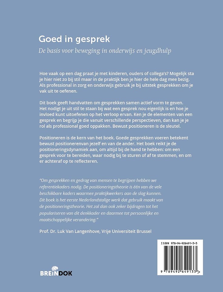 Positioneren is de kern van het boek. Goed in gesprek zijn, betekent bewust positioneren van jezelf en van de ander. Het boek reikt je de positioneringsdynamiek aan, om altijd bij de hand te hebben: om een gesprek voor te bereiden, waar nodig bij te sturen of af te stemmen, en om er achteraf op te reflecteren.