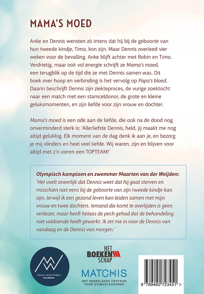 Anke en Dennis wensten zo intens dat hij bij de geboorte van hun tweede kindje, Timo, kon zijn. Maar Dennis overleed vier weken voor de bevalling. Anke blijft achter met Robin en Timo. Verdrietig, maar ook vol energie schrijft ze Mama’s moed, een terugblik op de tijd die ze met Dennis samen was. Dit boek over hoop en verbinding is het vervolg op Papa’s bloed. Daarin beschrijft Dennis zijn ziekteproces, de vurige zoektocht naar een match met een stamceldonor, de grote en kleine geluksmomenten, en zijn liefde voor zijn vrouw en dochter.