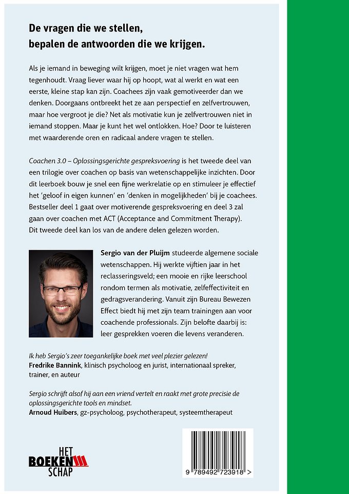 Meer over Sergio van der PluijmReclasseringscliënten, uitkeringsgerechtigden en spijbelende leerlingen zijn vaak gemotiveerder dan we denken. Doorgaans ontbreekt het ze aan perspectief en zelfvertrouwen. Maar hoe vergroot je dat? Net als motivatie kun je zelfvertrouwen niet in iemand stoppen. Maar je kunt het wel ontlokken. Hoe? Door te luisteren met waarderende oren en radicaal andere vragen te stellen. Zelfstandig coach en trainer Sergio van der Pluijm beschrijft in zijn tweede boek van de serie Coachen 3.0 dit keer de methode Oplossingsgerichte Gespreksvoering. Het boek verschijnt op 30 november 2019 en is dan ook landelijk verkrijgbaar.