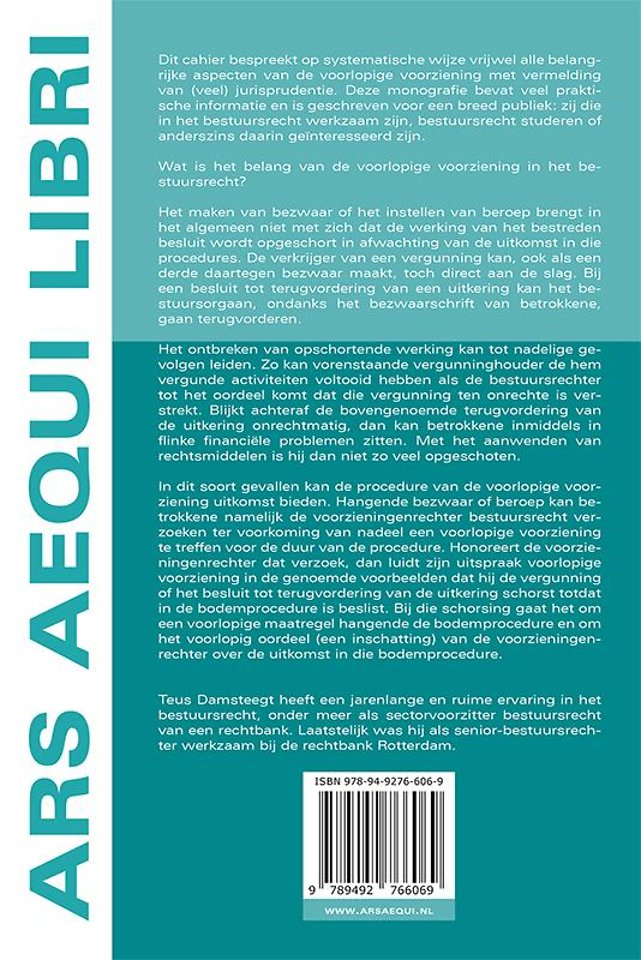 Dit cahier bespreekt op systematische wijze vrijwel alle belangrijke aspecten van de voorlopige voorziening met vermelding van (veel) jurisprudentie. Deze monografie bevat veel praktische informatie en is geschreven voor een breed publiek: zij die in het bestuursrecht werkzaam zijn, bestuursrecht studeren of anderszins daarin geïnteresseerd zijn.