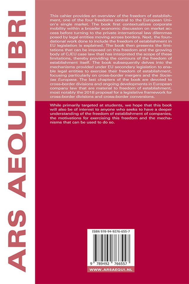 This cahier provides an overview of the freedom of establishment, one of the four freedoms central to the European Union’s single market. The book first contextualizes corporate mobility within a broader economic discussion on market access before turning to the private international law dilemmas posed by legal entities moving across borders.